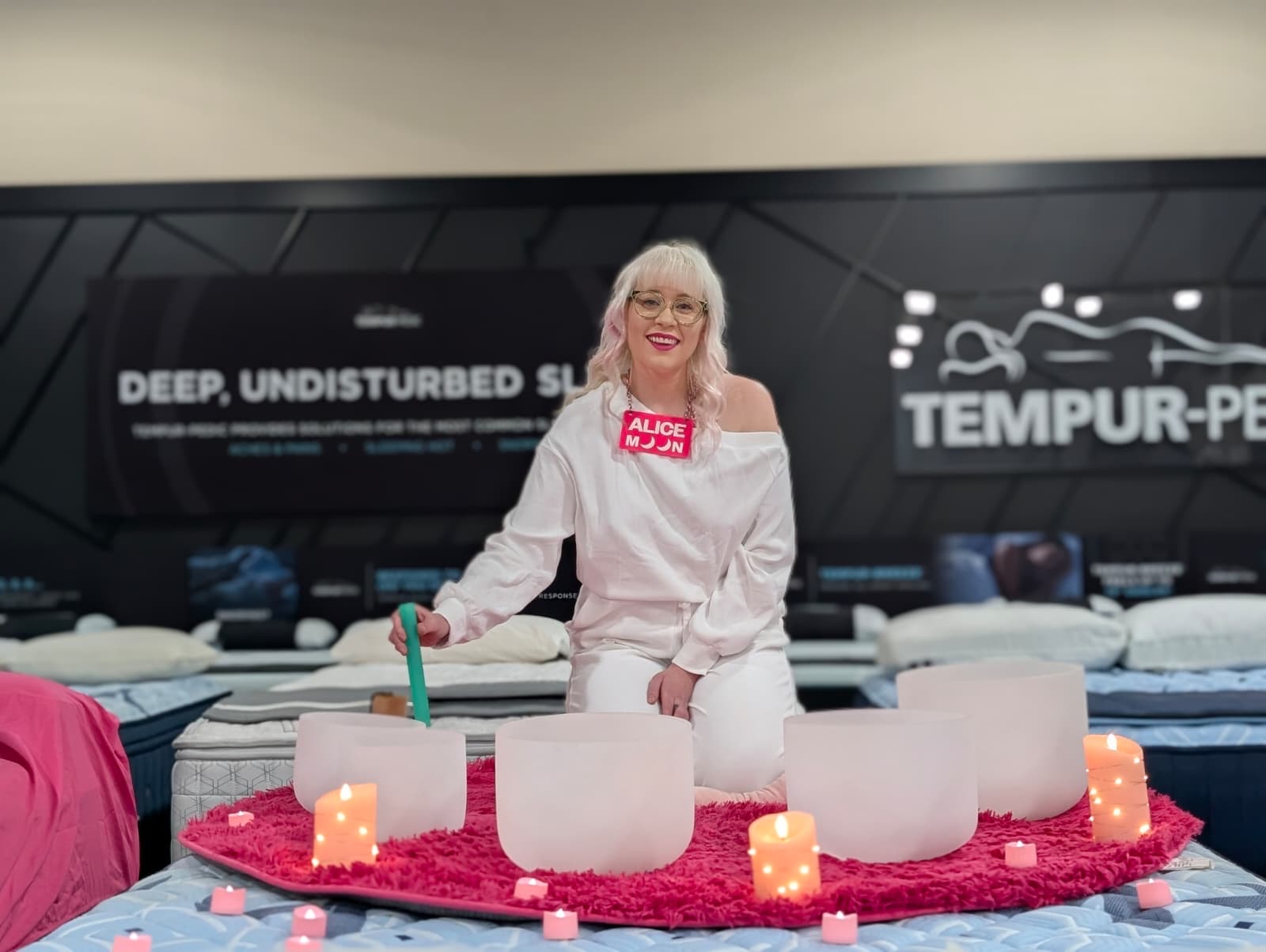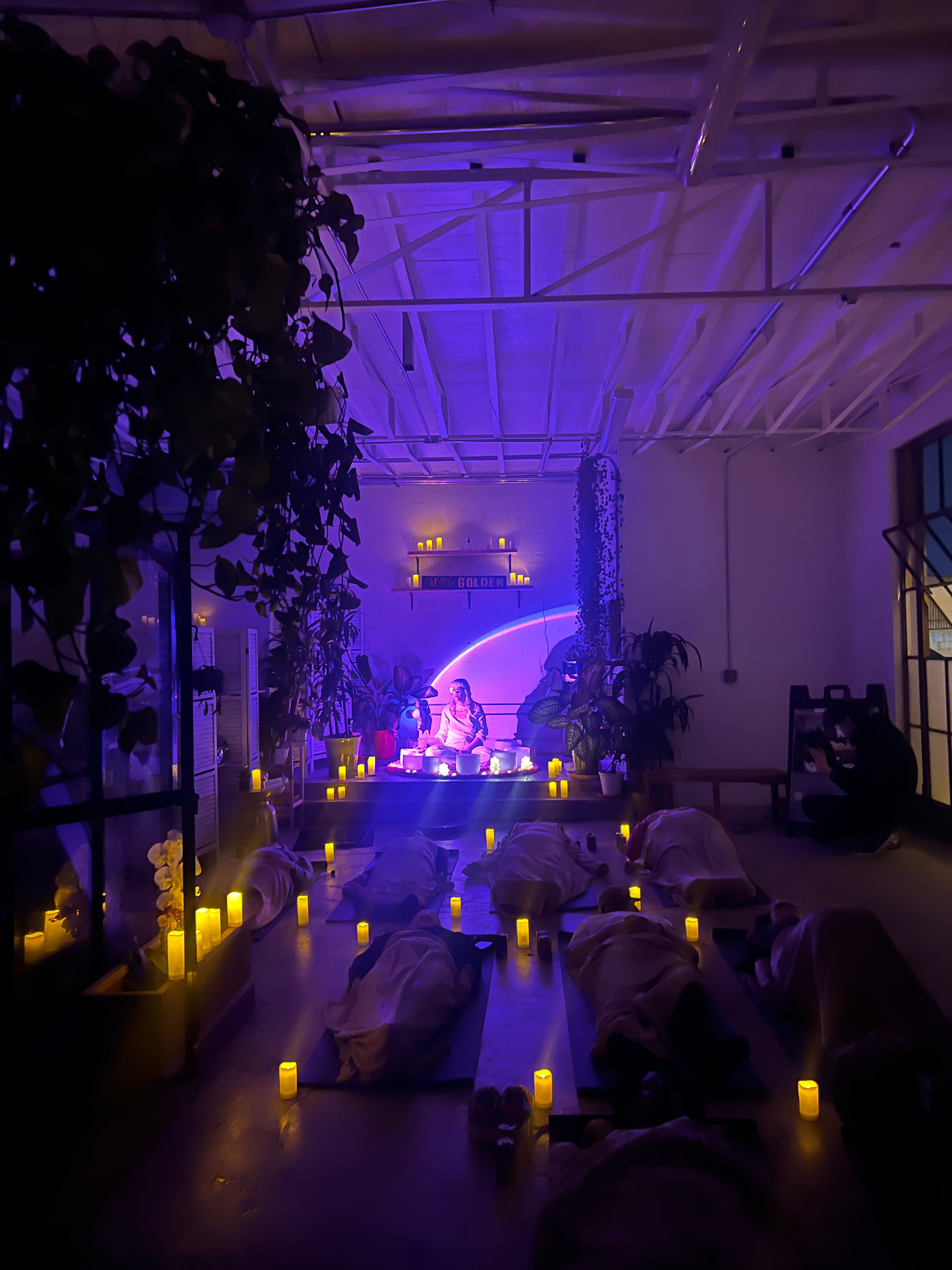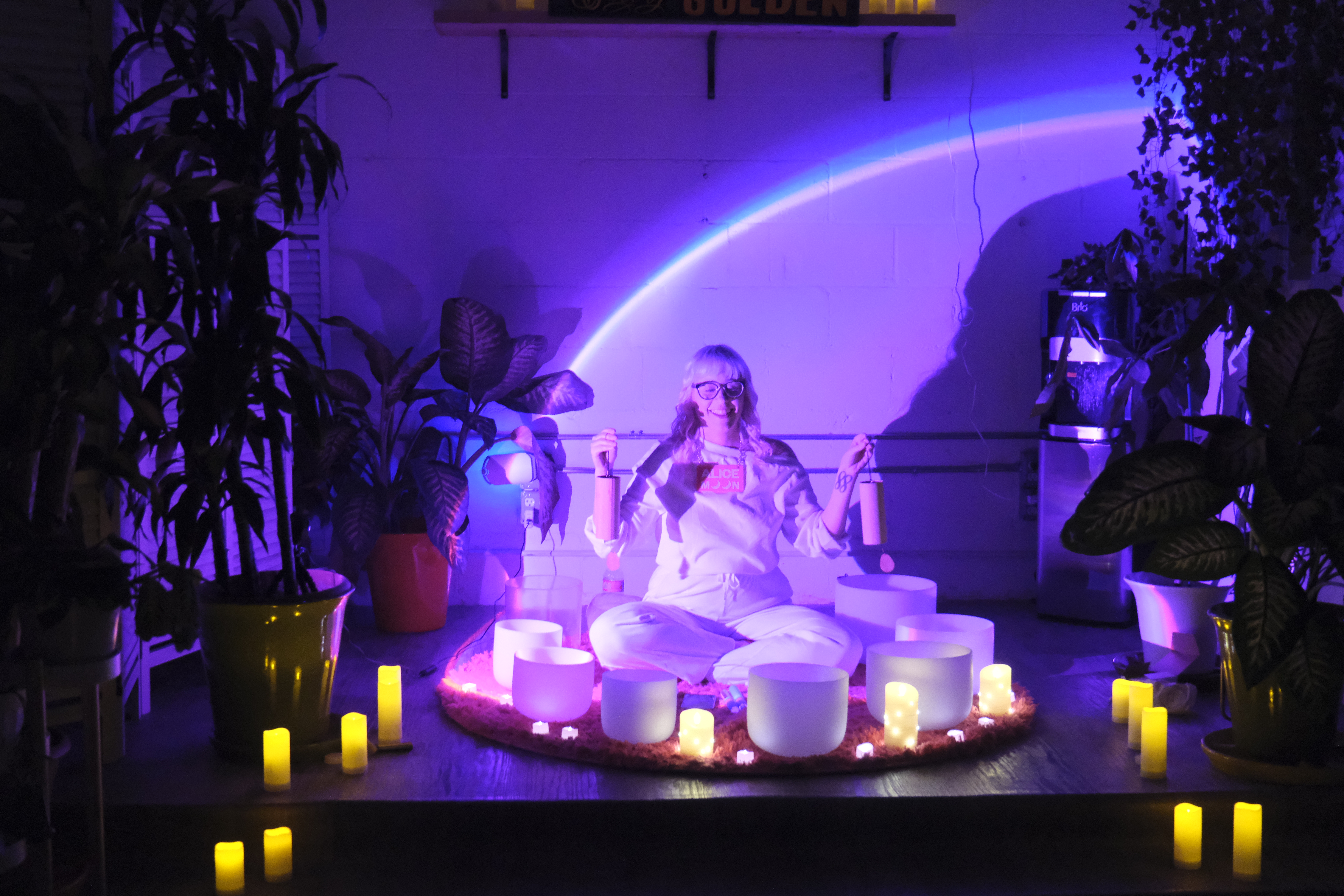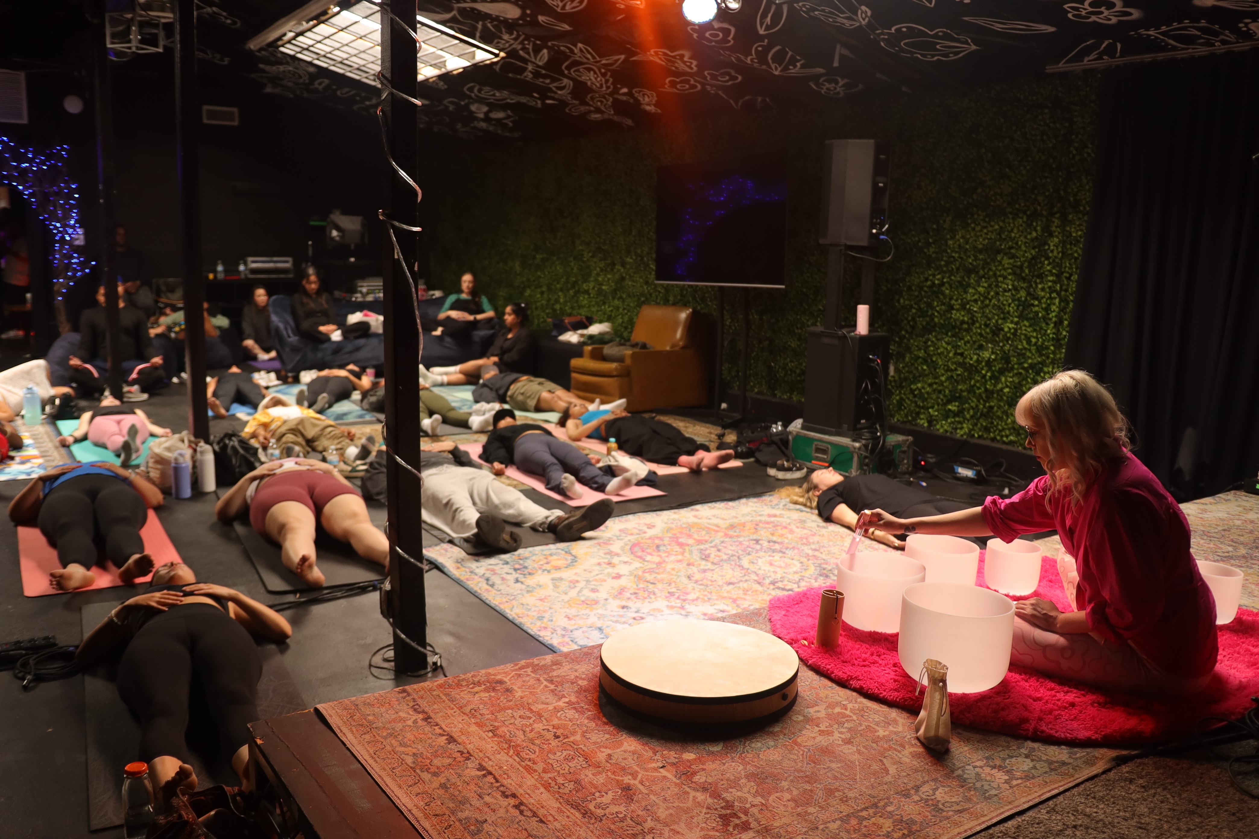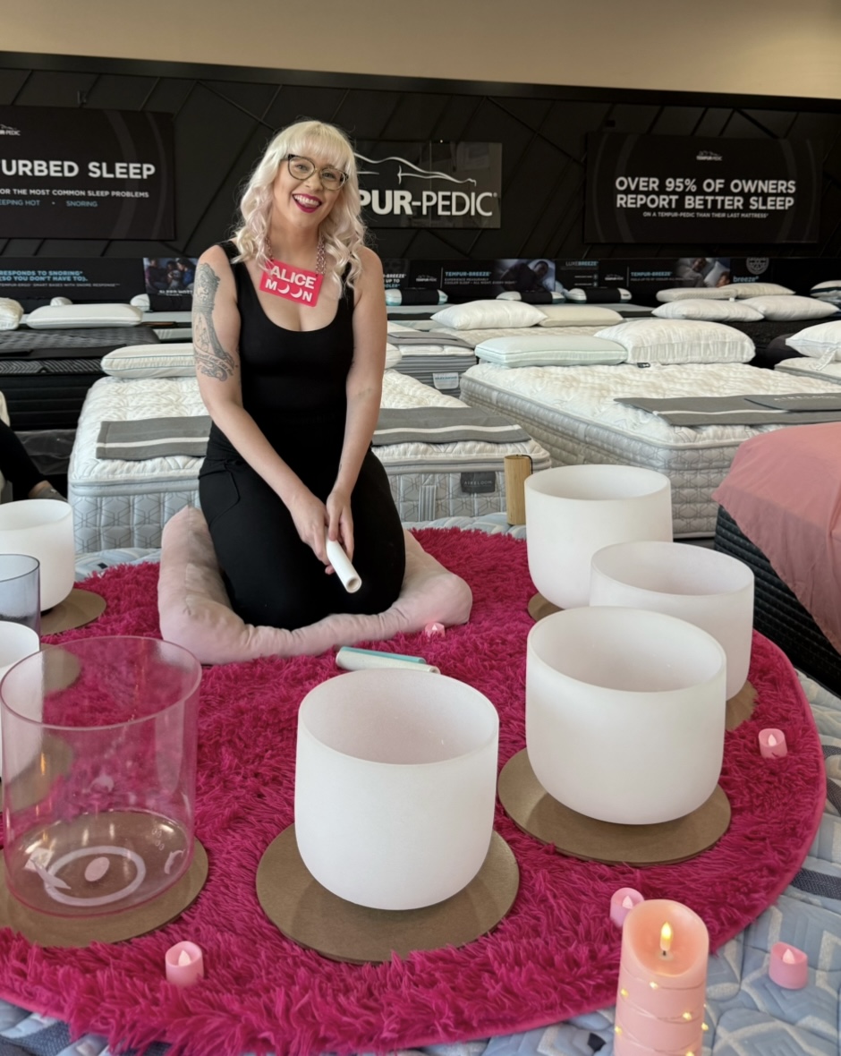 Alice Moon has performed sound baths at a variety of venues and events including a mattress store in Atwater Village, a venue in West Adams, retreats held at private homes, and corporate wellness days. Here’s some photos of Alice Moon in her sound bath element to get an idea of the vibe she brings.
